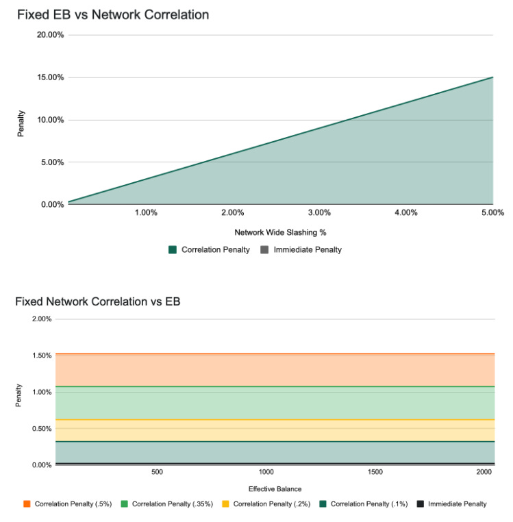 A simple visualization makes this clear. Holding effective balance fixed (e.g. ~1,000 ETH), total per-validator loss rises linearly with the fraction of network stake slashed, with the immediate penalty acting as a small fixed floor and the correlated component dominating once correlation increases. Conversely, holding correlation fixed, loss scales linearly with effective balance. These two curves, loss vs. EB and loss vs. correlation, fully characterize slashing severity under the protocol.