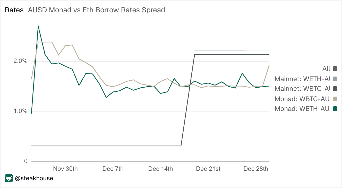 AUSD borrowing rates on Morpho differ across chains when comparing the same pairs. On Monad, both WETH/AUSD and WBTC/AUSD pairs are currently incentivised and have negative borrow rate (note that instantaneous rates are between 1-1.5%).