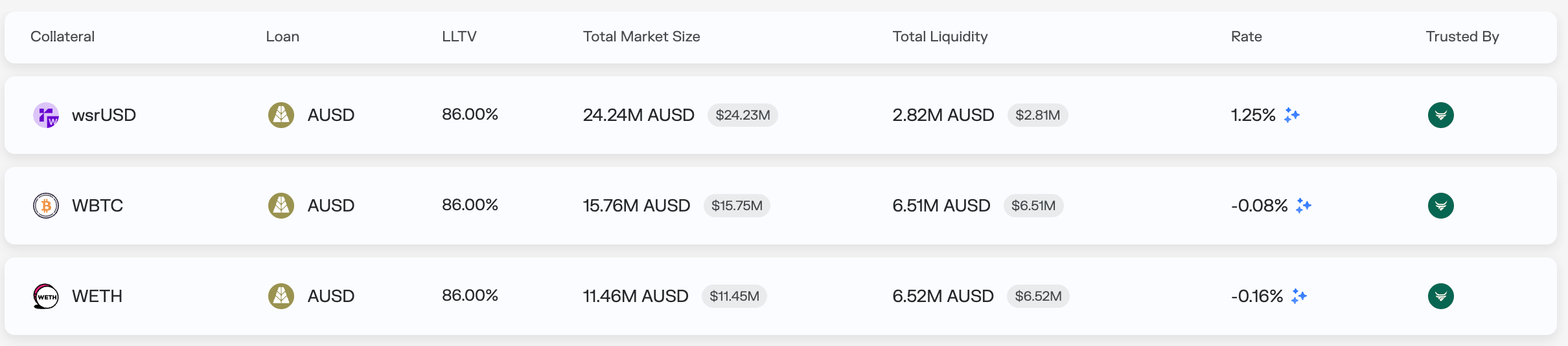 On Ethereum mainnet, the same WETH–AUSD and WBTC–AUSD pairs borrow between 2-3%, resulting in a rate spread for otherwise comparable collateral profiles.