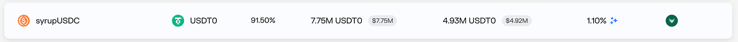 As a result, the SyrupUSDC/USDT market currently has a borrow rate at around 1.1%, compared with roughly 4% on Mainnet for the same pair.