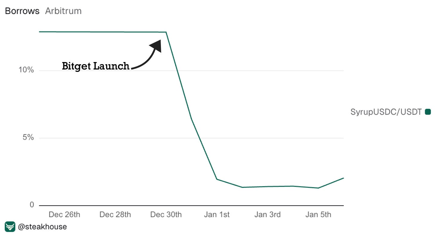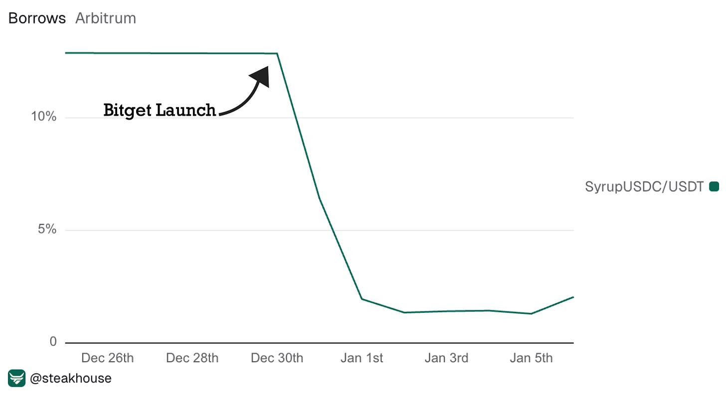 Additionally, on Arbitrum, the SyrupUSDC/USDT borrow market has benefitted from strong liquidity inflows after Bitget’s late-December On-Chain Earn launch, aligning with a noticeable drop in USDT borrow rates.