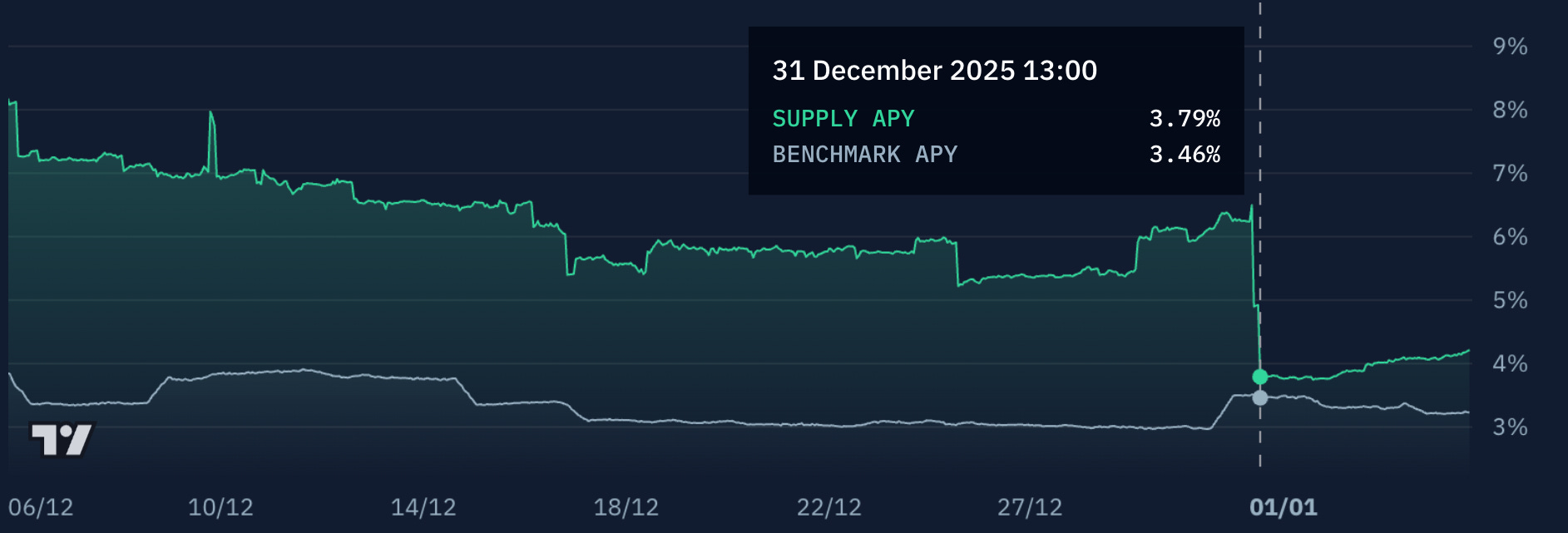 Year-end APY dislocations tend to be driven by year-end portfolio optimisation rather than changes in underlying fundamentals, with leverage unwound into the calendar reset and typically rebuilt in early January. Whether fiscally motivated or part of broader market positioning, the resulting rate compression is one to watch for borrowers seeking cheaper debt during these transitional periods.