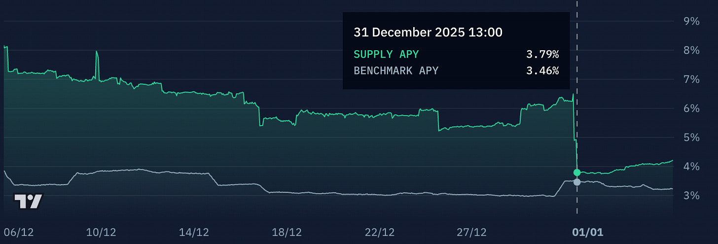 This dynamic was reflected in the USDC Prime vault on Kamino, where supply APY decreased sharply on 31 December, falling from 6.5% to below 4% within few hours before the EOY.