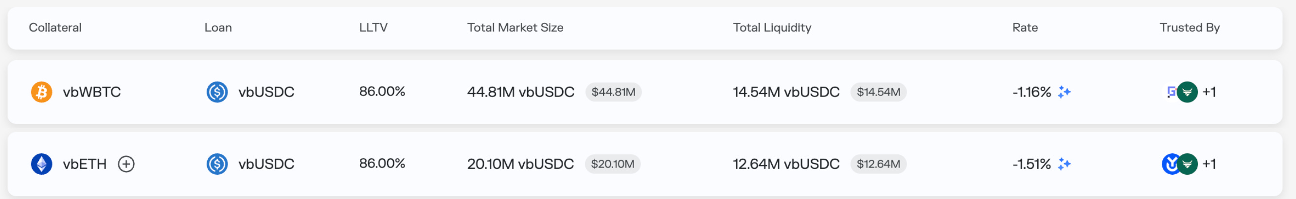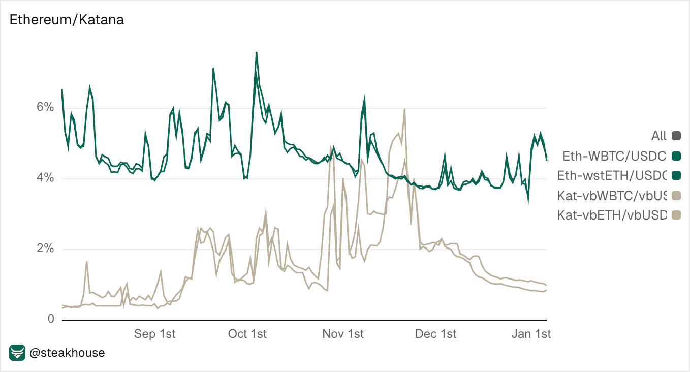 On Katana, borrow markets remain actively incentivised, with rewards paid in KAT (currently not tradable, leaving room for speculation around its eventual launch price👀). Borrow rates for vbETH and vbWBTC are therefore around -1.5% and -1.15% respectively.