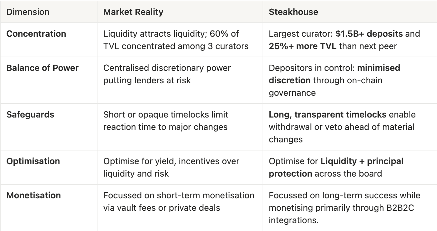At Steakhouse, these ideas are implemented on the application layer. Vaults are built as open, strictly non-custodial financial products with decentralised governance, where parameters are enforced through onchain rules - this structure closely aligns with the low-risk DeFi framework outlined by Vitalik.
