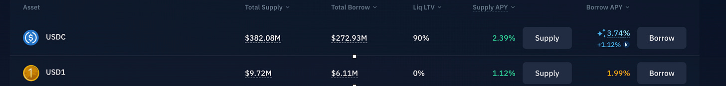 On Kamino, supplied USDC (earning 2.4% APY) can be used as collateral to borrow USD1 for 1.99% APY.