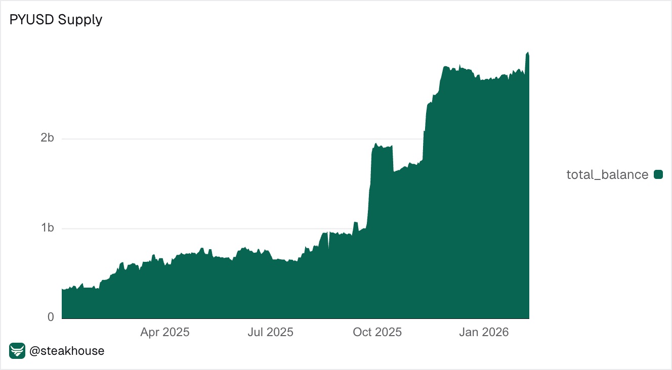 The stablecoin environment continues to diversify on-chain. USD1 more than doubled over the past month (+53% MoM) to approximately $5.3B, while PYUSD grew 5.3% MoM to around $3.8B. Combined, these absorbed roughly $2.5B in new supply, closely matching the contraction observed in USDC.