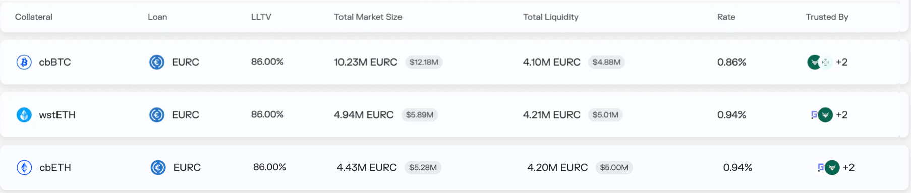 Borrowing EURC against cbBTC, wstETH, WETH, and cbETH is available at rates between 0.86% to 0.94%, with LLTVs set at 86%.