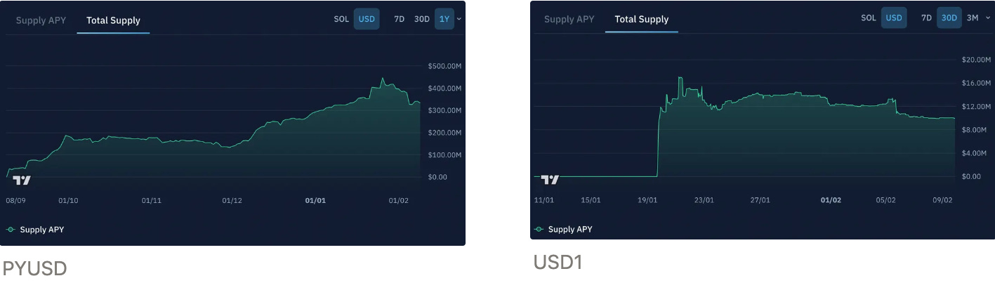 The migration is largely driven by incentivised stablecoin markets across lending platforms. PYUSD and USD1 have seen aggressive incentive programmes across DeFi, pulling supply toward subsidised yields. On Kamino, the PYUSD vault curated by Sentora has grown to $333m since its September 2025 launch, but utilisation remains low at 44%.