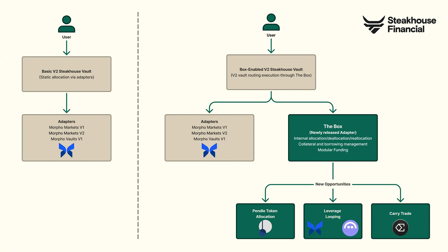 Steakhouse is introducing The Box, an extension for Morpho Vault V2, that expands vaults capabilities to support direct allocation and leverage, while maintaining a state of the art non-custodial model.