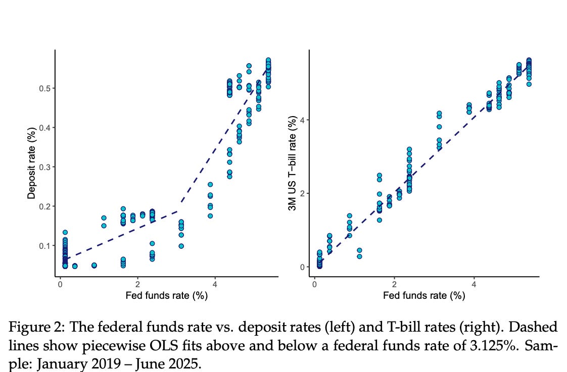 The authors’ mechanism is that deposits and stablecoins both serve money-like functions, so users can shift between them when relative attractiveness changes. Once Fed rates move above circa 3.125%, banks start passing more of those increases through to depositors, which is the key pattern they use to isolate deposit repricing shocks that are associated with slower stablecoin market cap growth.