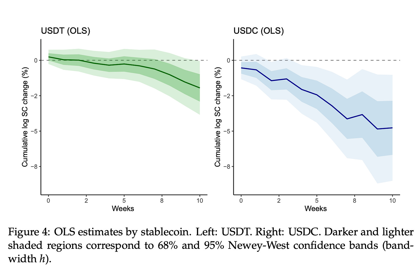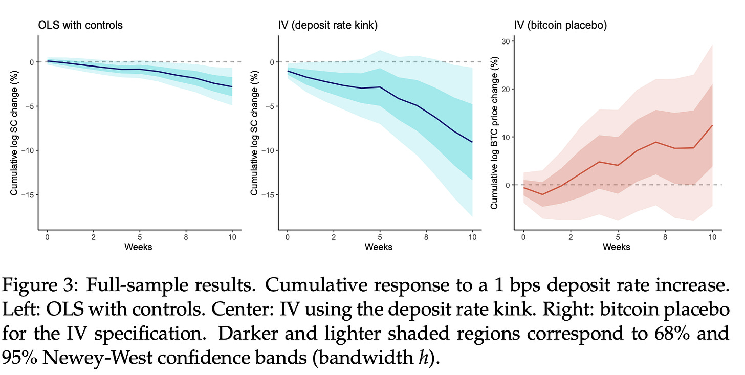 They test this in two steps. First, they run an Ordinary Least Squares (OLS) regression, which uses the raw observed relationship between weekly deposit-rate changes and stablecoin growth. They then add an Instrumental Variables (IV) approach, which uses the deposit-rate kink in Figure 2 to isolate the part of deposit-rate moves that comes from banks passing through more of Fed tightening once rates are above about 3.125%. Both estimates are negative, implying weaker growth in reserve-backed stablecoin market capitalisation after deposit rate increases, not necessarily an outright decline in supply.