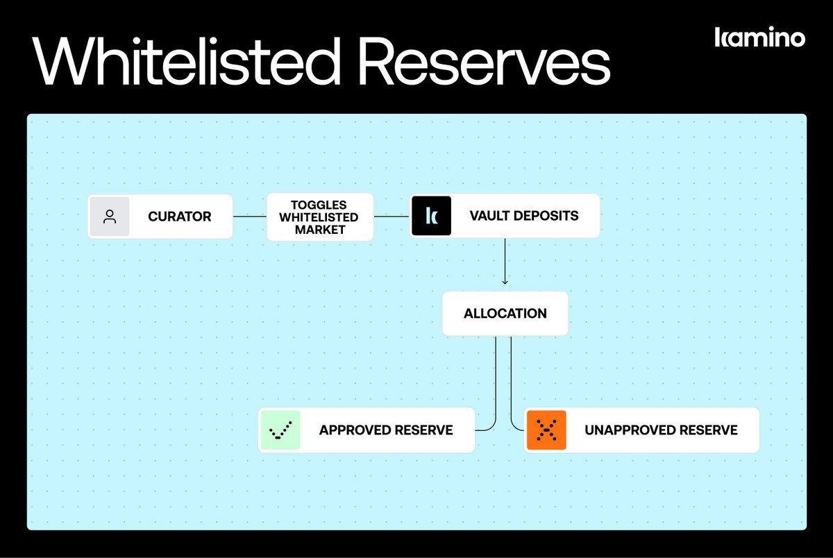 Kamino introduced ‘Whitelisted Reserves’ for Lending Vaults, an irreversible smart contract setting for the curator that limits vault allocations and investments to reserves verified by the platform, and it is now enabled on all vaults shown on Kamino’s UI.