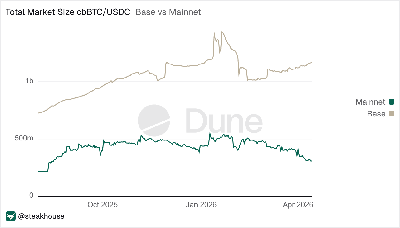 That divergence lines up with the underlying market activity. USDC borrowing demand is stronger on Base, especially in the large BTC-backed markets (Coinbase Borrow product). The cbBTC/USDC market on Base stands at $1.18B and grows, versus $310M on Ethereum which is shrinking with BTC price.