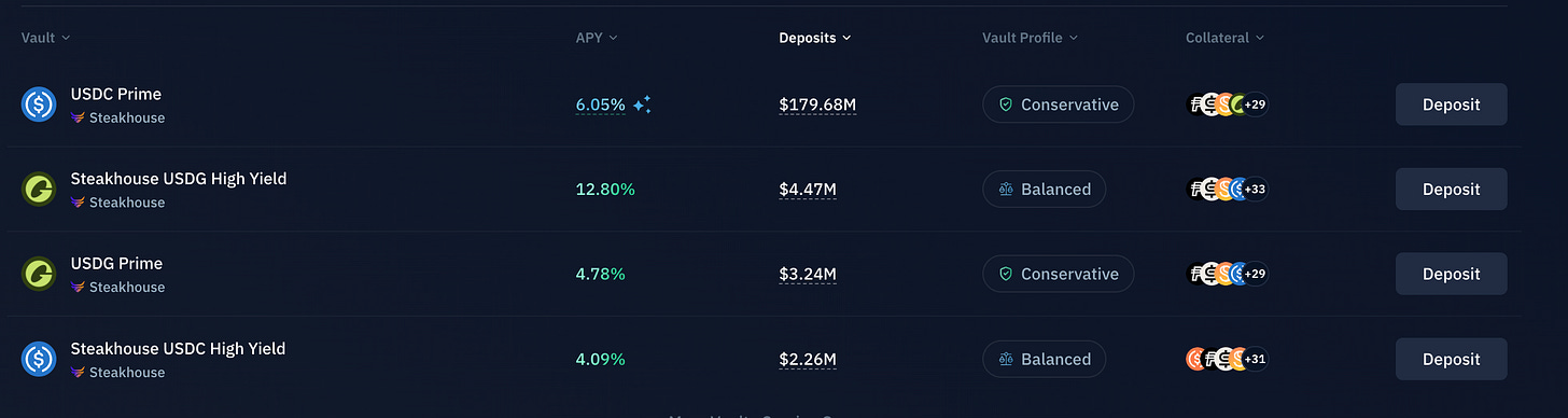 Our TVL is spread accross multiple vaults driven by our Prime category as a best-in-class risk-adjusted vehicle for noncustodial exposure to the DeFi economy.