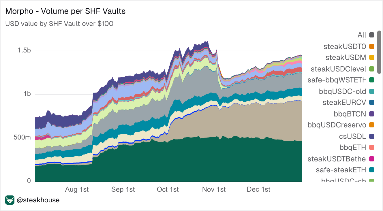 We deployed over 32 V2 vaults that are now live on Morpho, delivering a future-proof, trust-minimized framework for onchain asset management. Steakhouse curates the largest number and highest total value of V2 vaults on the protocol.